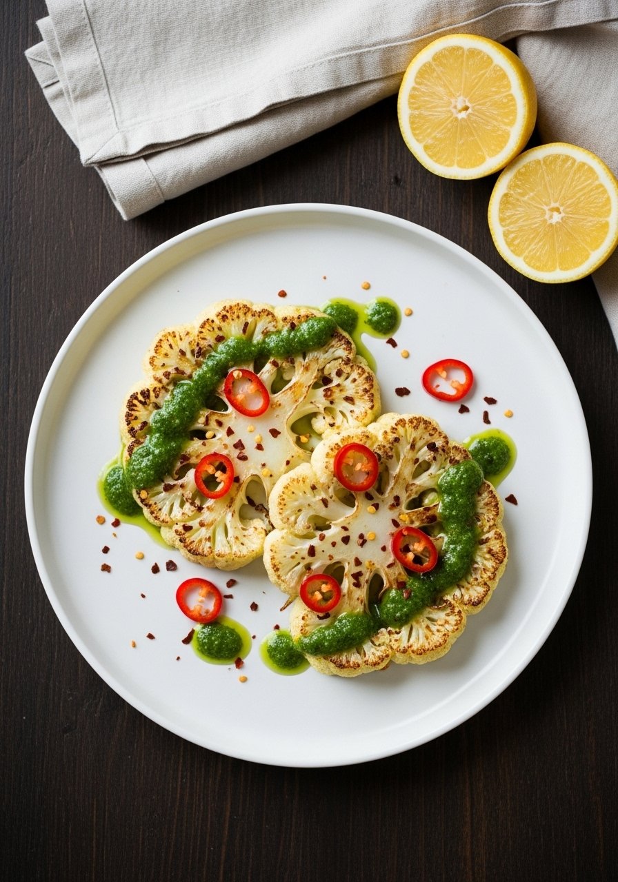 Thick cauliflower slices roast until caramelized and meaty. The garlic-herb sauce adds bright acidity and salt to balance the roasted sweetness. This is a veggie-forward main that feels substantial and stays well under budget.