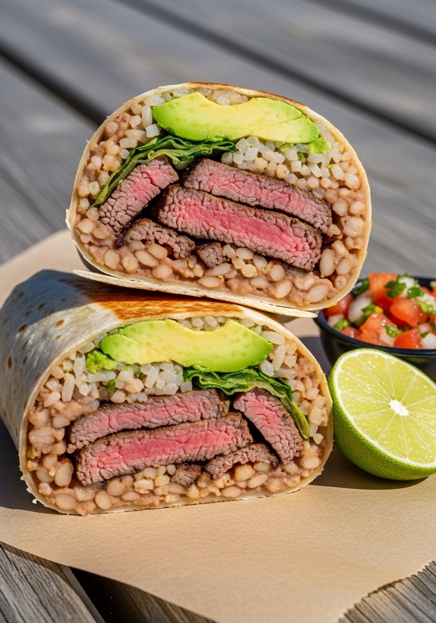 For a fresher, California-style burrito, thinly sliced grilled carne asada brings smoky, charred flavor that contrasts with creamy refried beans and bright pico de gallo. This is the “best carne asada burrito” for backyard grilling or a stovetop cast-iron sear if you don’t have a grill.