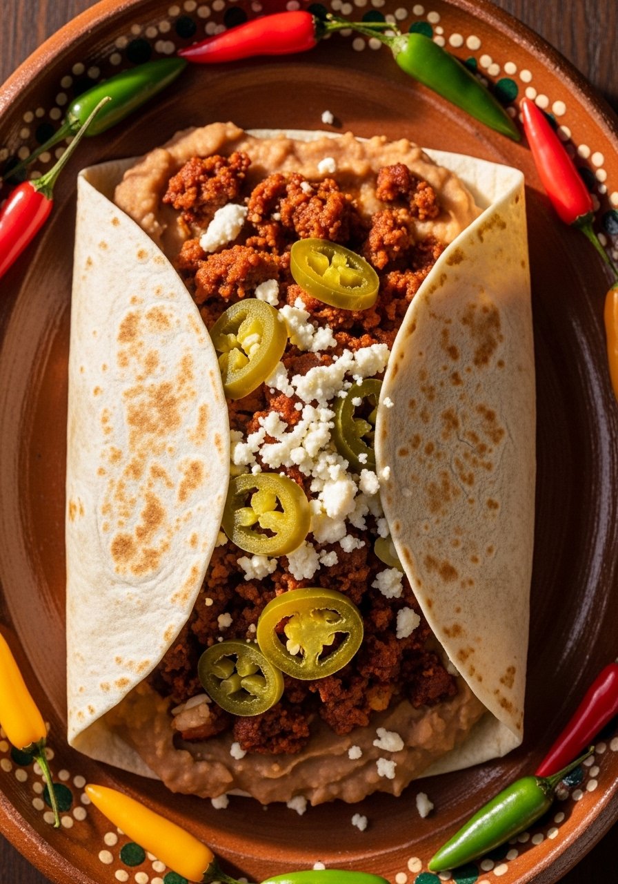 This bean-forward burrito leans into traditional Mexican flavors: savory chorizo, creamy refried pinto beans, and a little pickled heat. It’s a wallet-friendly, satisfying option that tastes like street-style without the fuss. The refried beans act as a glue so the tortilla rolls tight and doesn’t tear.