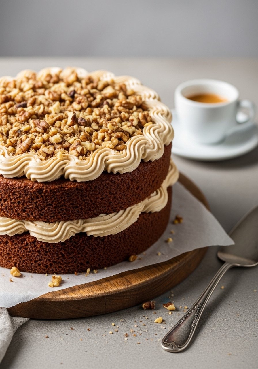 7. Cool and frost with coffee buttercream. Use a cake turntable for smooth frosting if you want a polished finish.