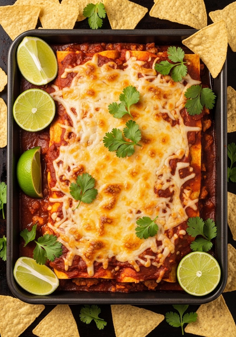 - Spread a thin layer of enchilada sauce across the bottom of the pan (wet-to-dry layering helps prevent sogginess).