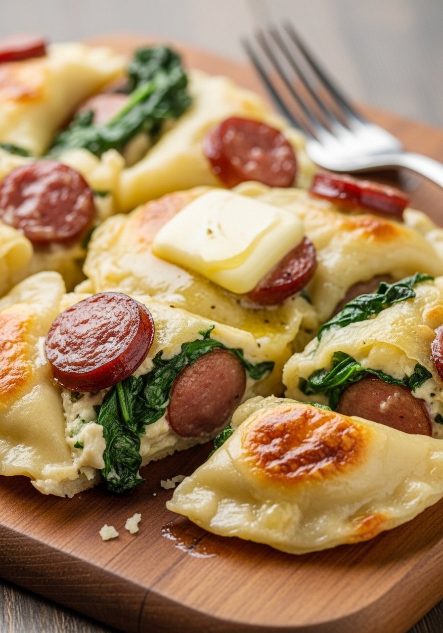 Frozen pierogis get a grown-up upgrade in this savory bake. Sausage and spinach add savory depth while a creamy, cheesy sauce keeps everything tender. It’s playful, quick, and hits that comfort spot.