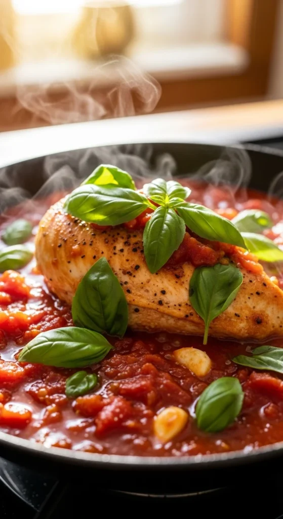 Fresh tomatoes and basil bring brightness to this quick stovetop dish. The sauce stays light while keeping the chicken moist. It’s especially good when tomatoes are at their best.