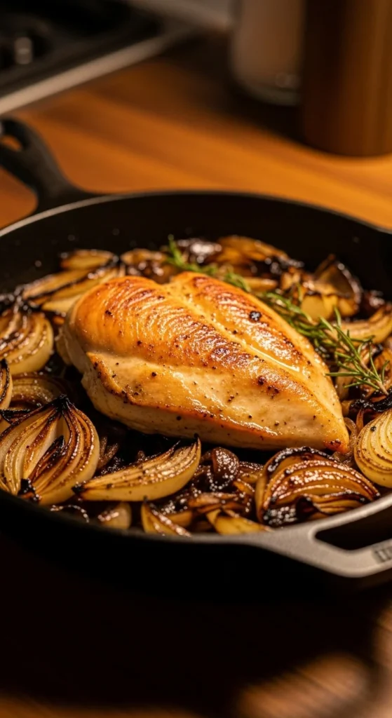 Slow-cooked onions add natural sweetness that pairs beautifully with chicken. Everything cooks in one pan, making this recipe both comforting and practical.