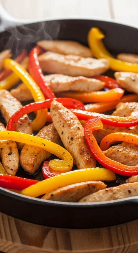 Sweet peppers soften into a light sauce while the chicken cooks. It’s colorful, quick, and family-friendly.