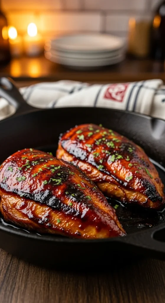 This recipe delivers bold flavor without firing up the grill. The sauce thickens right in the pan, giving the chicken a deep, smoky finish.