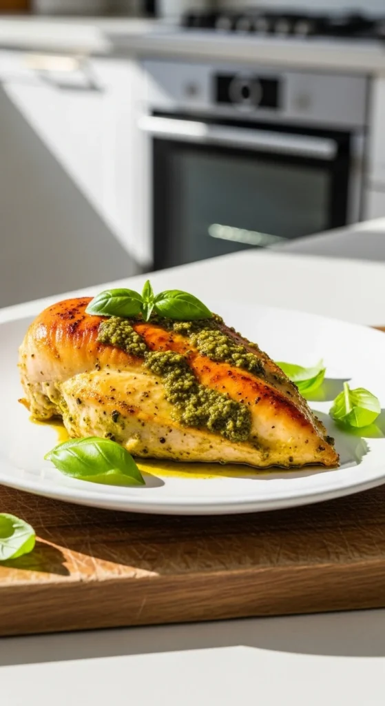 Pesto adds instant flavor and moisture. Baking keeps cleanup simple and results consistent.