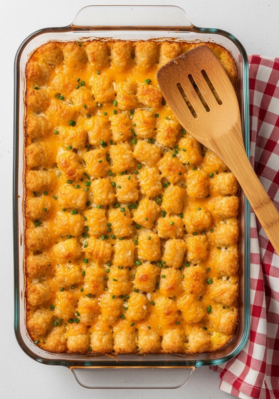 7. Bake 30–35 minutes until tots are golden and cheese is bubbling. For extra crisping, broil 2–3 minutes while watching closely.