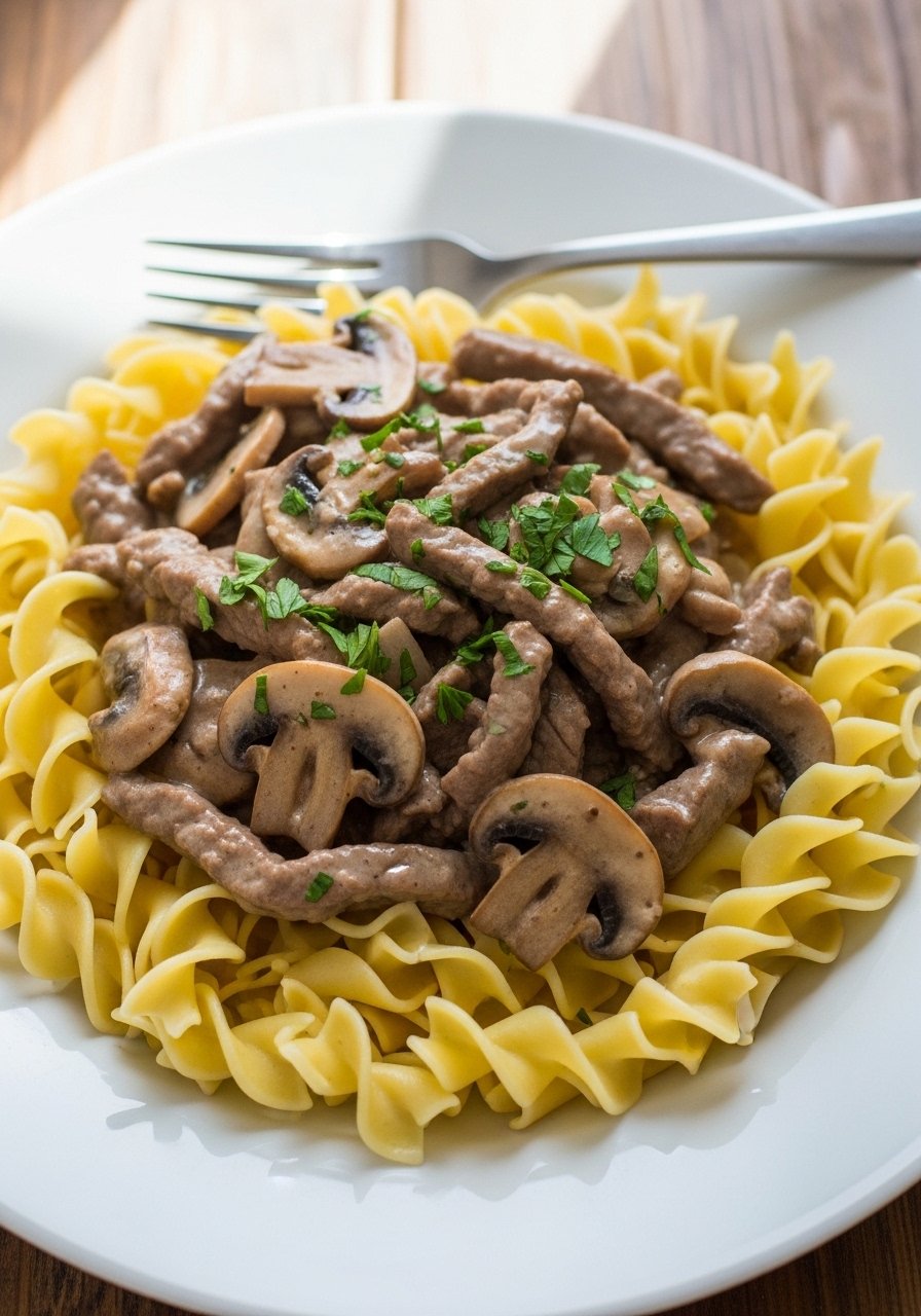 Spoon stroganoff over cooked egg noodles or mashed potatoes. A digital kitchen thermometer helps check beef temperature for perfect doneness. Store in airtight food containers for up to 3 days; reheat gently on the stove with a splash of broth.