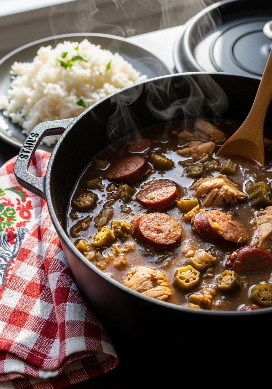 8. Chicken & Sausage Gumbo (Cajun-style roux and holy trinity)