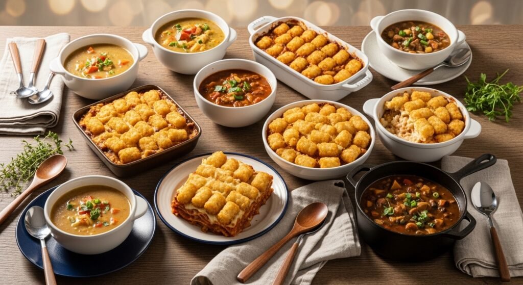 This tater tot casserole leans into nostalgia with a savory beef base and a crunchy tot crown. The casserole balances creamy, savory filling with crispy texture on top—an instant kid- and adult-friendly crowd-pleaser. It’s a cheap, satisfying weeknight option that reheats well.