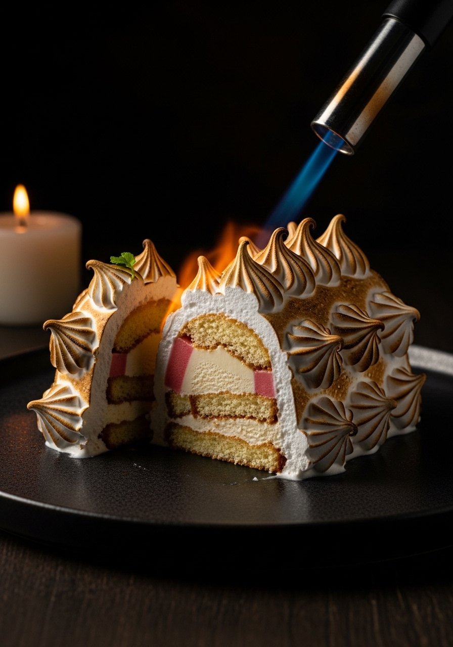 Slice with a hot, dry knife for clean cuts. Serve immediately with a fruity coulis or a drizzle of chocolate sauce. For storage, keep the frozen dome before finishing in the freezer wrapped in plastic; assemble and torch just before serving.