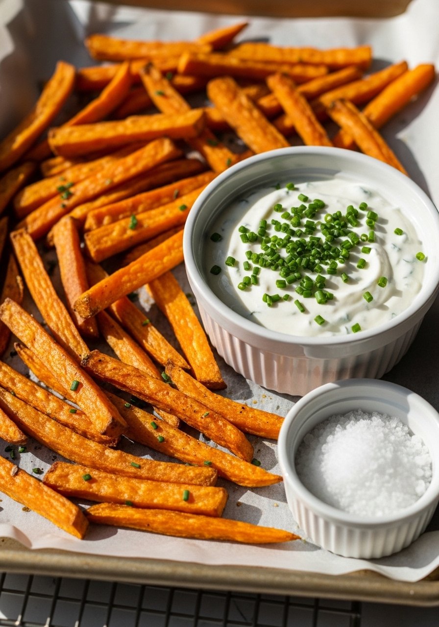 Sweet potato fries are comforting but boosted with fiber and beta-carotene—baked until crisp, not fried. Paired with a tangy yogurt-herb dip, they become a satisfying snack that feels indulgent but stays wholesome. They're slightly sweet, lightly caramelized, and make a great veggie-forward swap for traditional fries.