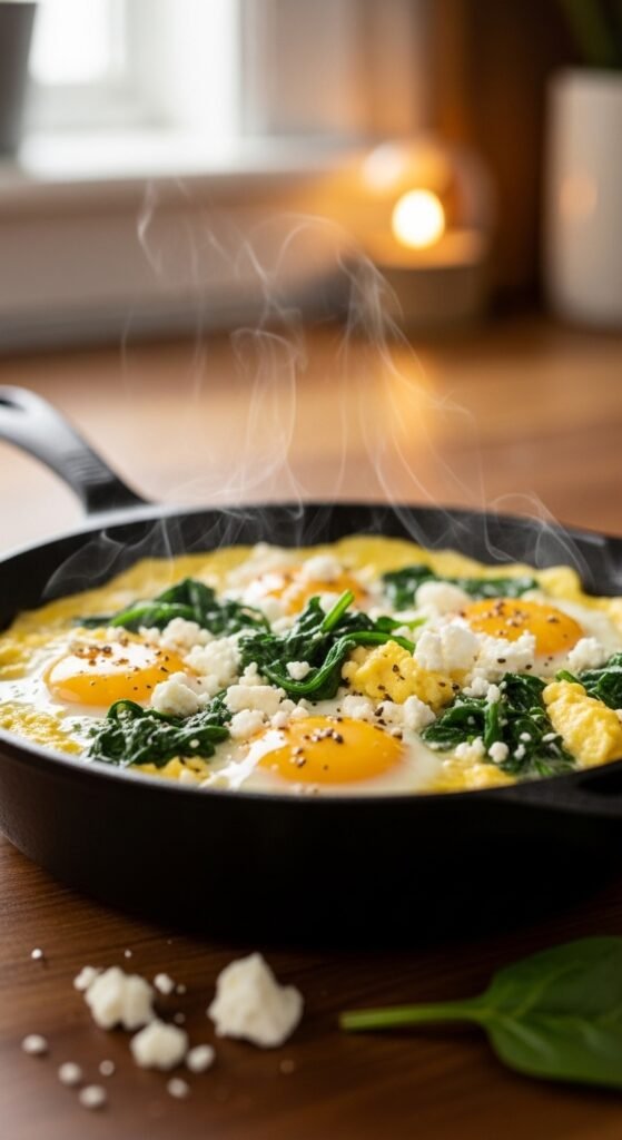 This protein scramble is quick, flavorful, and perfect for breakfast or a light dinner. Eggs provide high-quality protein while spinach and feta add freshness and savory depth. It cooks in minutes and keeps you full without feeling heavy.
