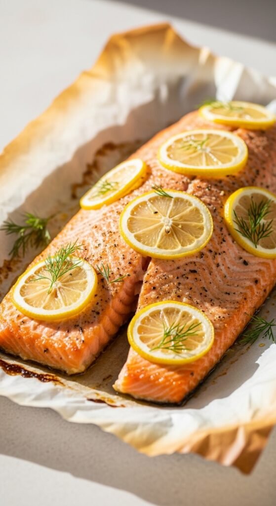 Baked salmon offers high-quality protein along with healthy fats that support steady energy. Lemon and dill brighten the rich flavor without overpowering it. It’s an easy dinner that cooks quickly and pairs well with simple sides. This dish works beautifully when you want something light yet filling.