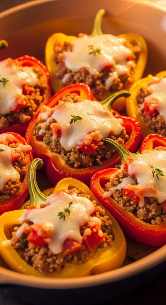 These stuffed peppers combine lean turkey and quinoa for a balanced, protein-rich meal that feels hearty without being heavy. Tender peppers hold a savory filling seasoned with herbs and spices. It’s a complete meal in one dish, perfect for dinner or meal prep.