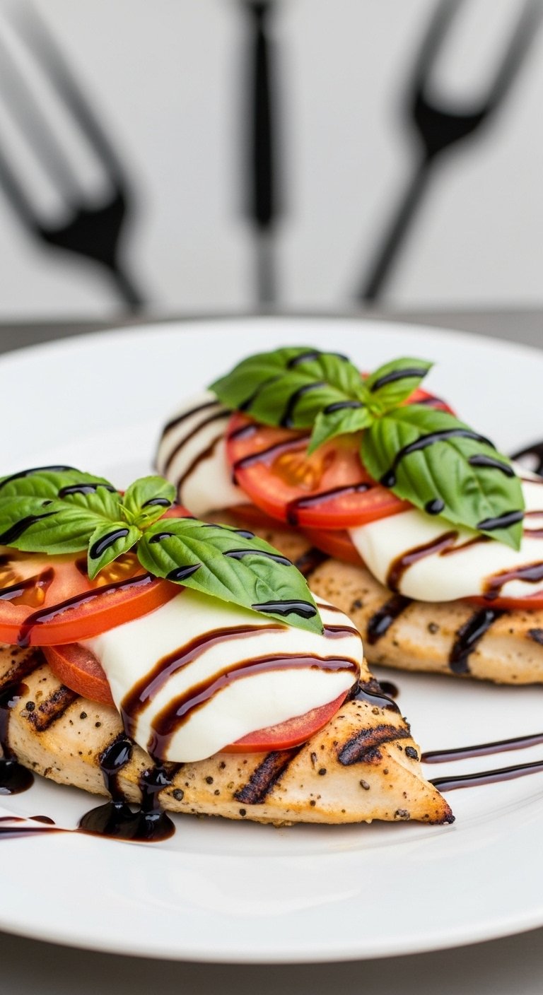 Caprese flavors—ripe tomatoes, fresh mozzarella, and basil—turn grilled chicken into a fresh, protein-forward dinner. A quick sear locks in juices and a balsamic reduction adds sweet tang.