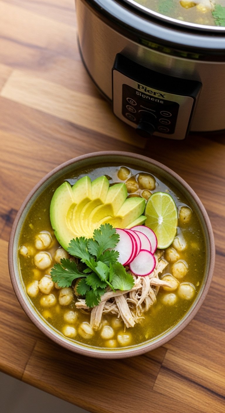 This pozole verde is comfort in a bowl with shredded chicken, hominy, and bright green chiles. Using a slow cooker makes it effortless—set it in the morning and come home to a high-protein dinner that feeds a crowd.