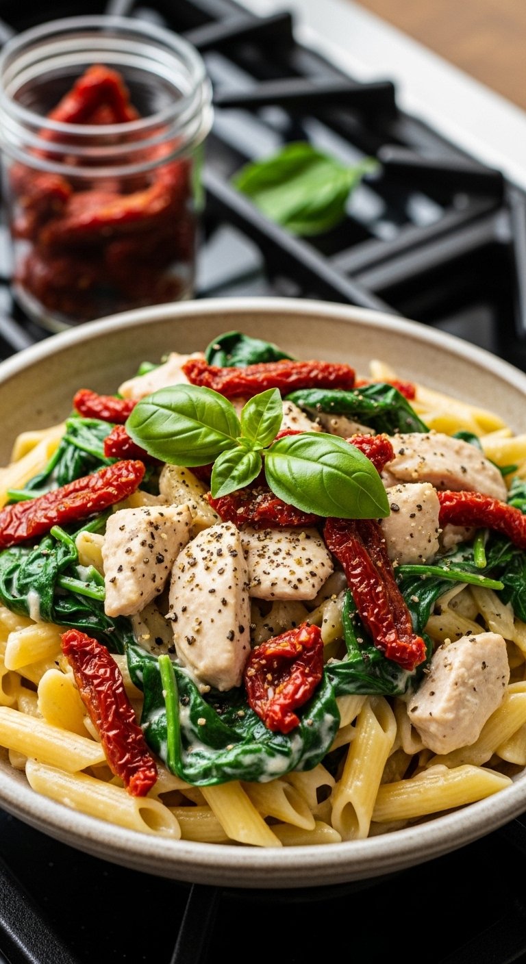 - Add spinach, sliced chicken, and pasta. Toss until heated through. Finish with basil and red pepper flakes.