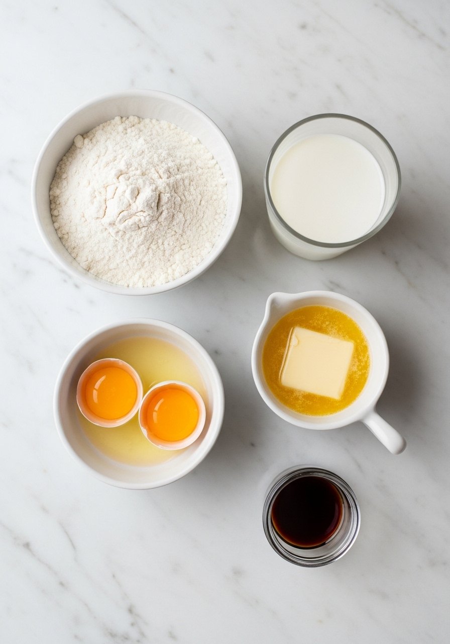 - Weigh ingredients for consistency: 125 g 00 flour, 2 large eggs, 300 ml milk, 1 tbsp melted unsalted butter, 1 tsp vanilla, and a pinch of salt. Use a digital kitchen scale and a glass measuring cup to avoid guesswork.