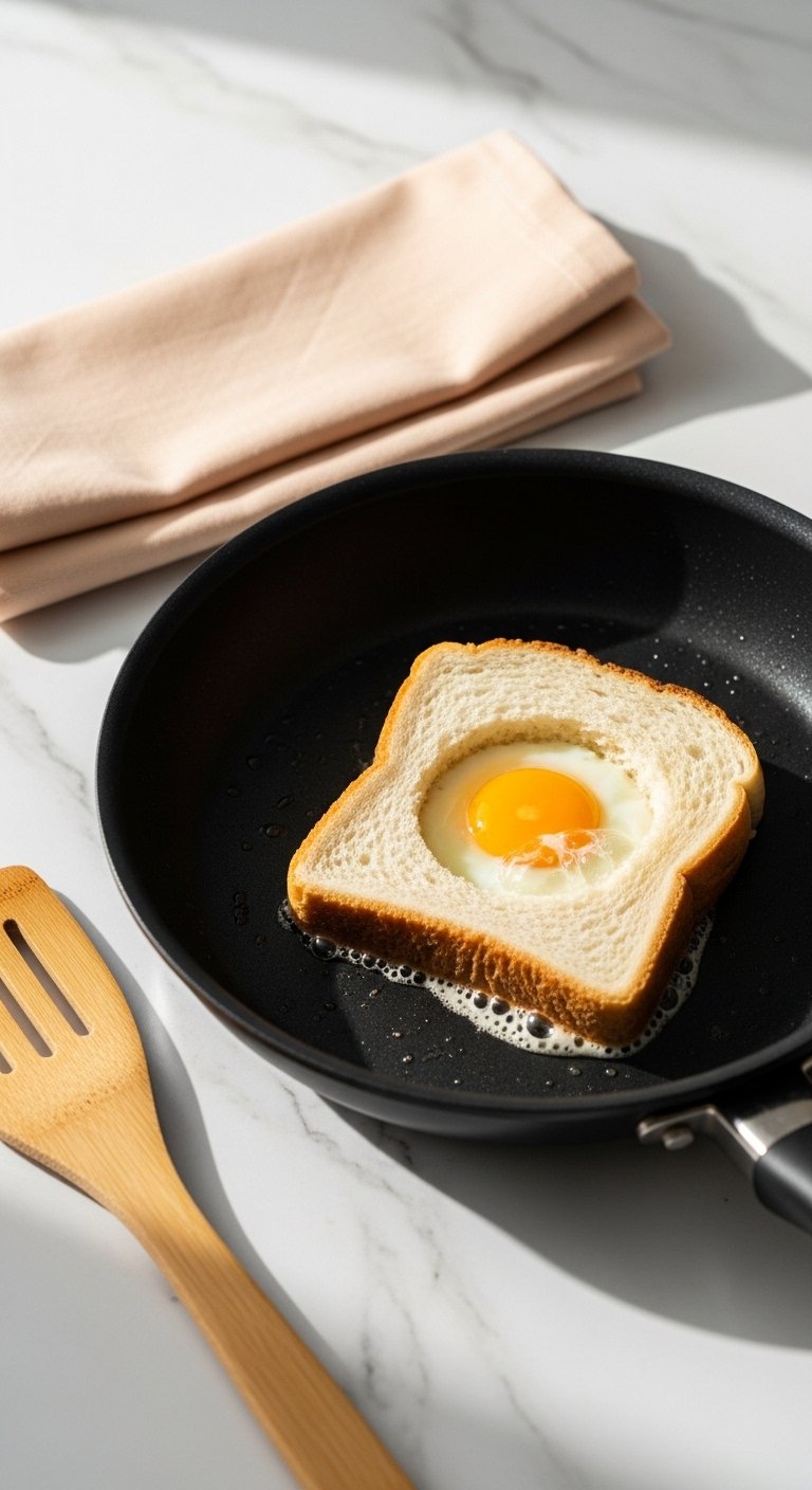- Egg-in-a-Hole — heat a non-stick skillet over medium, butter a slice, cut a circle, crack 1 egg, cook 2–3 minutes per side. Serve with fruit.