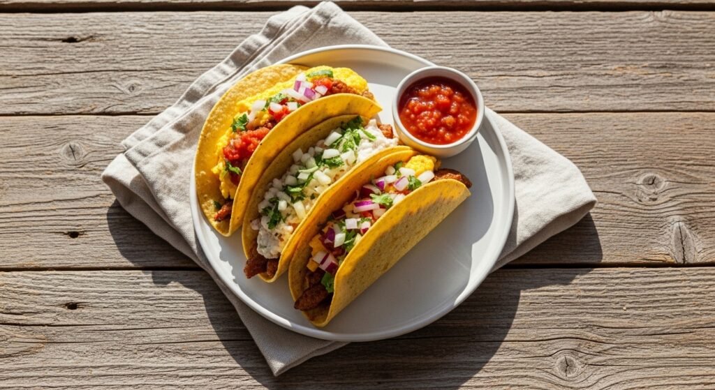 • Assemble simply: eggs + one meat + cheese + a spoon of Pace Salsa (Pace Salsa) and fresh cilantro. Avoid overfilling to keep tacos handheld.