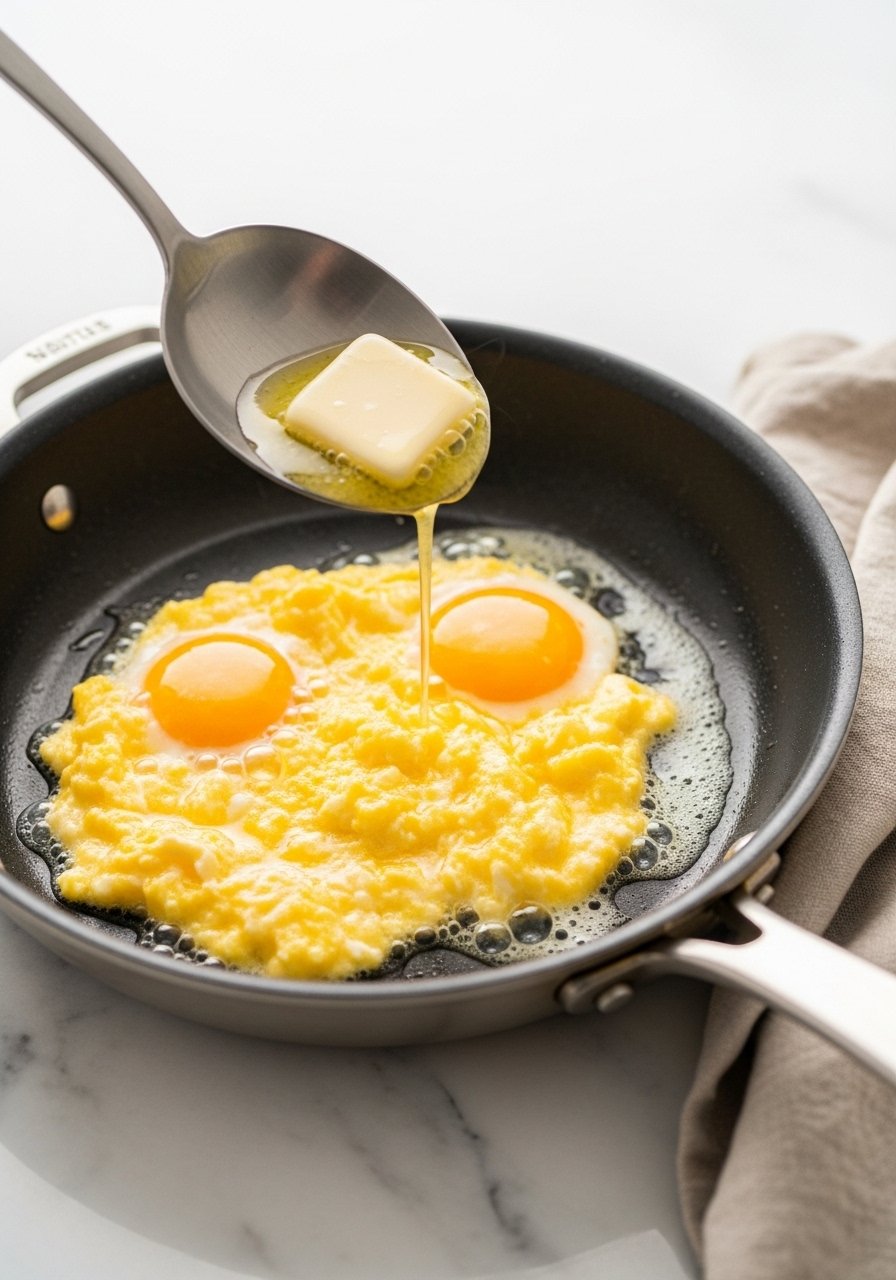 3. Lower heat to medium-low, add butter, then pour whisked eggs (with 1 tbsp water). Stir slowly for 1–2 minutes until soft curds form.