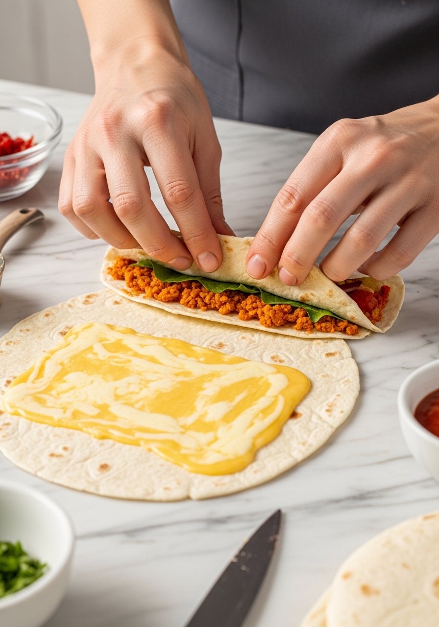 • Quadrant fold (TikTok fold): place fillings in the center, fold one side over the center, then the opposite, then bottom, then top. Cheese on the last layer acts like glue.