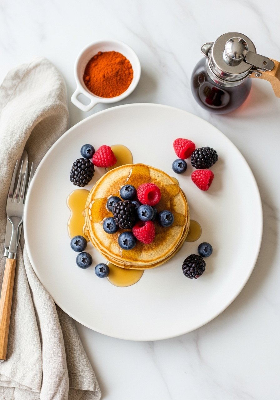 Pin-worthy final styling: stack pancakes unevenly, add a pat of butter or coconut cream, drizzle syrup in a thin stream, and include a fork with crumbs for a casual, inviting shot.