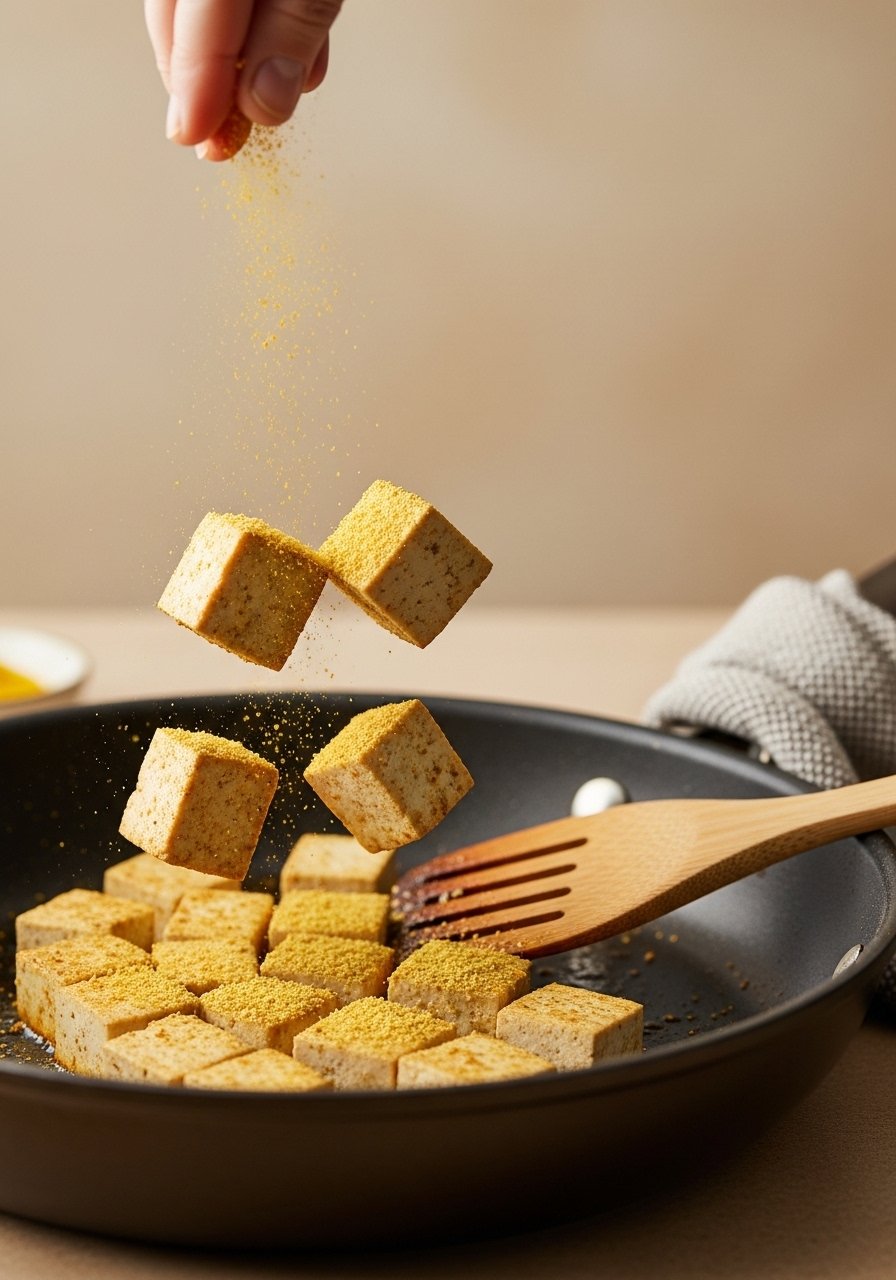 - Crumble one 14 oz extra-firm tofu, add 1 tsp turmeric, 2 tbsp nutritional yeast, smoked paprika, salt, and cook 4–5 minutes until edges crisp.