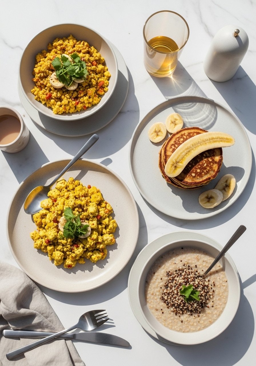 - Cost snapshot: tofu scramble runs about $1.50/serving; oat-banana pancakes about $1–2/serving.