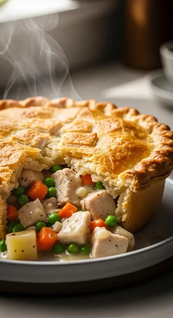 This pie has a creamy chicken filling wrapped in flaky pastry, making it perfect for cozy dinners and special occasions.