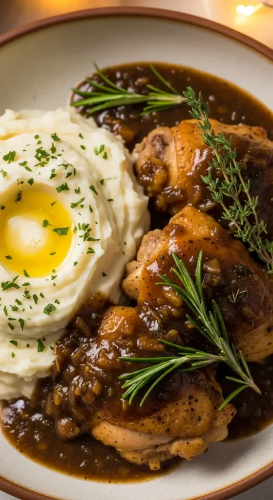 This dish focuses on rich gravy flavored with herbs, making each bite smooth and comforting.