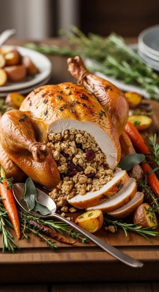Serve sliced with stuffing. Add gravy if desired. Pair with vegetables. Let rest before carving. Great for gatherings.