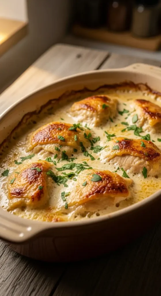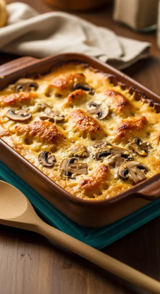 This casserole is baked slowly so the mushrooms release their flavor into the sauce, making the chicken deeply comforting and hearty. It’s ideal for family dinners and reheats well.
