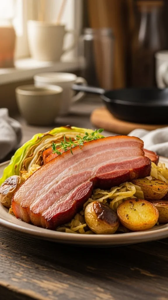 This dish balances salty bacon with soft cabbage and potatoes. It’s simple, filling, and deeply familiar.