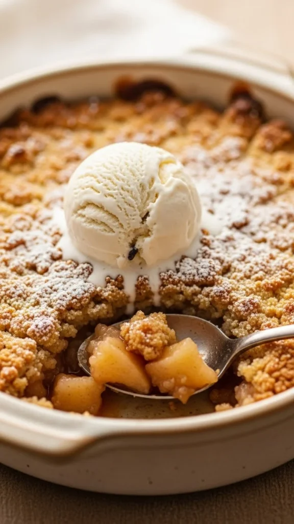 This dessert feels warm and familiar, with soft baked apples and a crumbly topping.