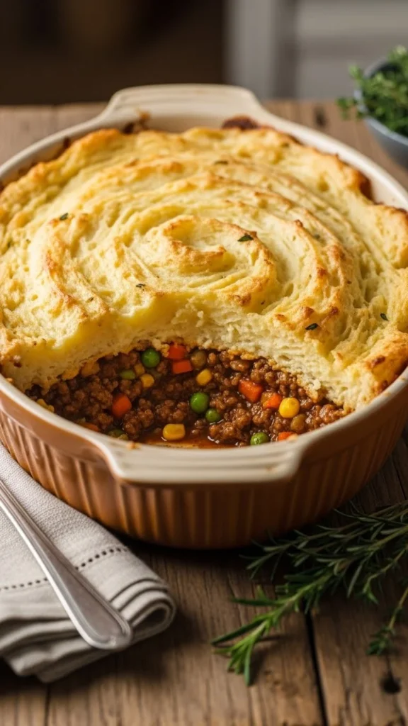 This dish layers savory minced meat with vegetables and a fluffy potato topping. It’s a full meal in one dish and always feels comforting.