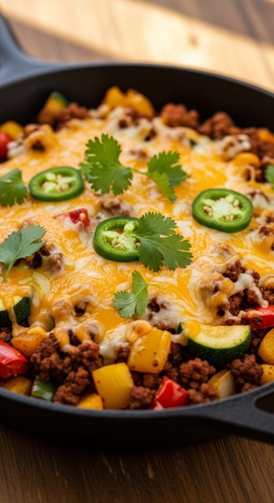 Serve straight from the skillet. Add sour cream or avocado slices. Lettuce cups work well for serving. Fresh cilantro adds color. Best served hot.