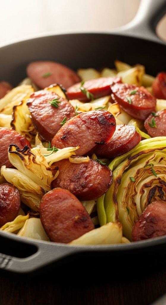 This skillet keeps ingredients simple while delivering bold flavor. Sausage adds richness and cabbage softens beautifully as it cooks. It’s filling and budget-friendly. Everything cooks in one pan. Great for cooler days.