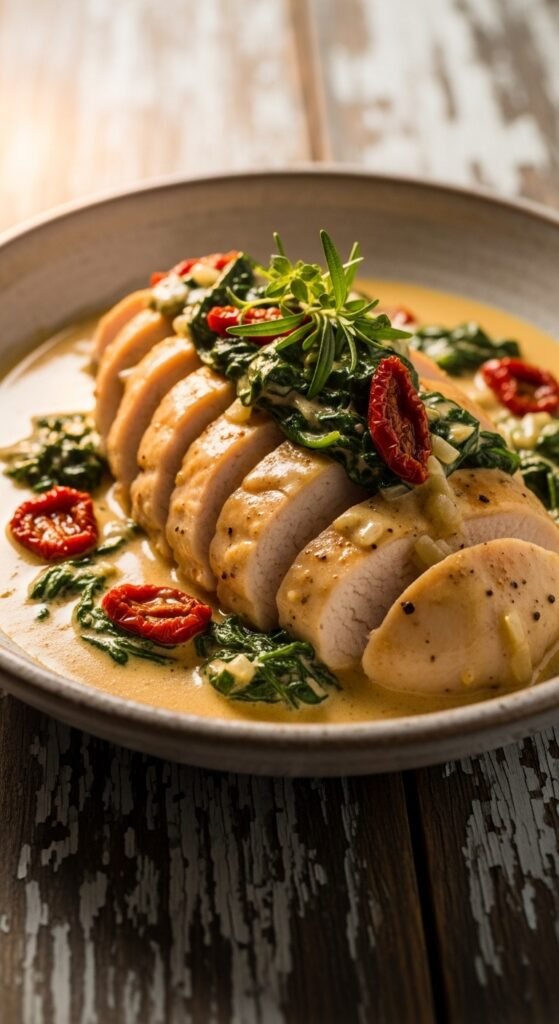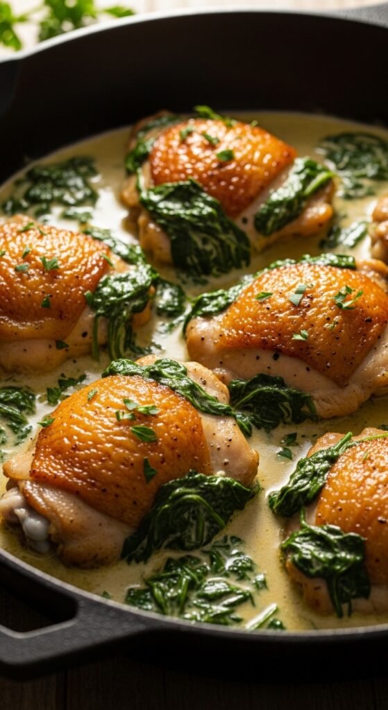 This dish pairs tender chicken with a smooth spinach sauce that feels rich and comforting. The spinach blends easily into the cream. It’s a dependable one-pan meal. Great for evenings when you want something filling. The flavors stay balanced and mild.