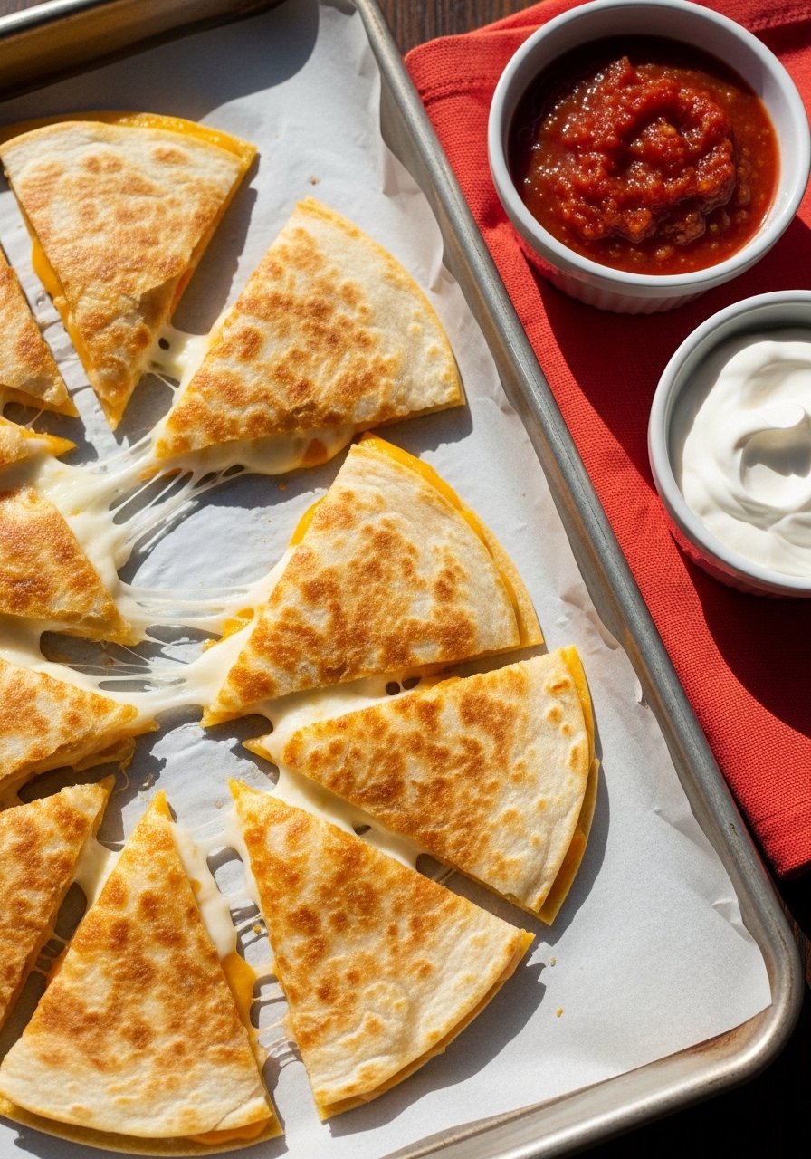 These sheet-pan quesadillas bake into crisp, cheesy wedges with zero flipping and minimal babysitting. They’re customizable, easy to cut into kid-sized triangles, and perfect for batch cooking when you're feeding a crowd. The texture is crunchy on the outside and gooey inside. Kids love the familiar cheese pull; you’ll love the one-pan cleanup.