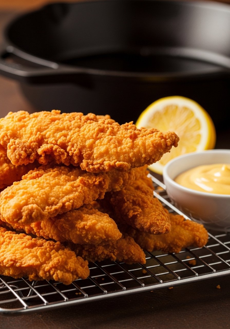 4. Dredge tenders in dry mix, shake off excess, and fry in batches 4–5 minutes until golden and internal temp 165°F.