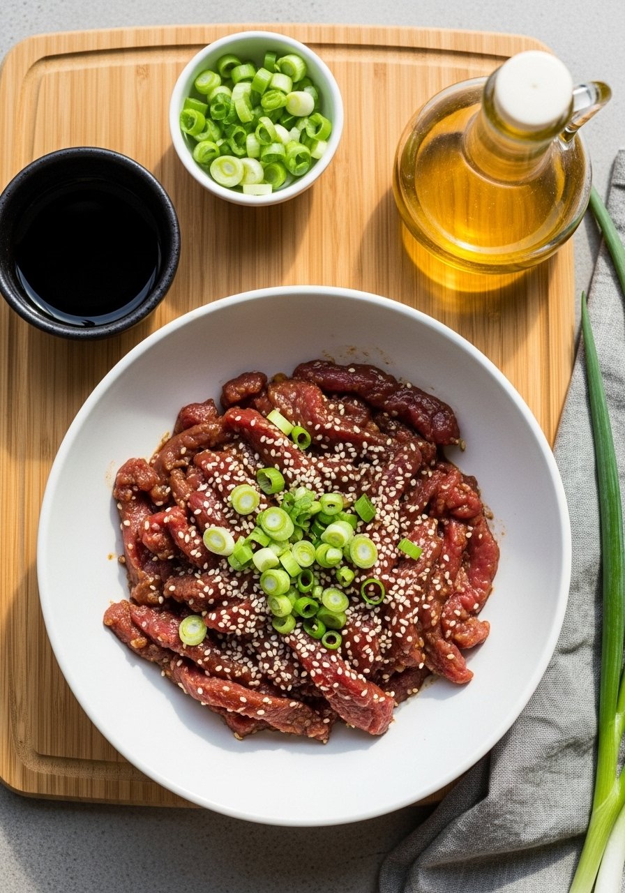 - Place 1.5–2 lbs thinly sliced beef (or pork/tofu) in a shallow dish and pour marinade over it.