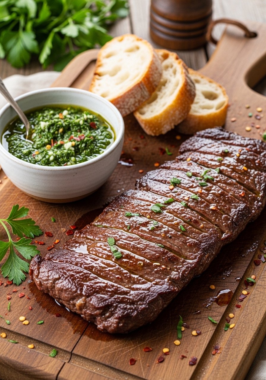 Serve sliced steak on a wooden board with chimichurri and grilled vegetables. Store extra chimichurri in a mason jar in the fridge for up to 5 days—bring to room temp before using. Works great with roasted potatoes or on crusty bread.
