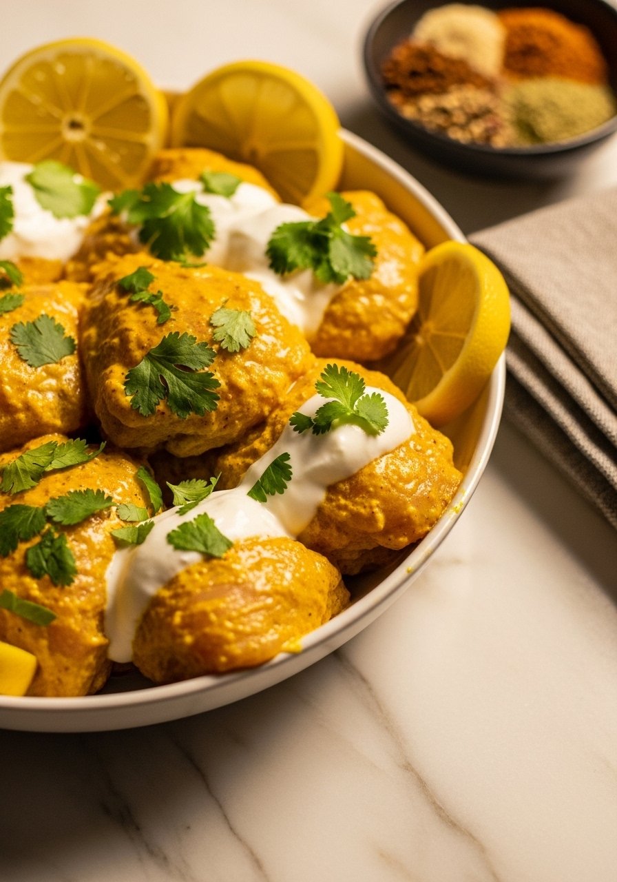 This creamy yogurt-turmeric marinade tenderizes and infuses meat with warm, aromatic spices. Yogurt’s lactic acid gently breaks down proteins for juicy results, while turmeric adds color and subtle earthiness. It’s ideal for kebabs, roasting, or grilling and pairs beautifully with naan or rice.
