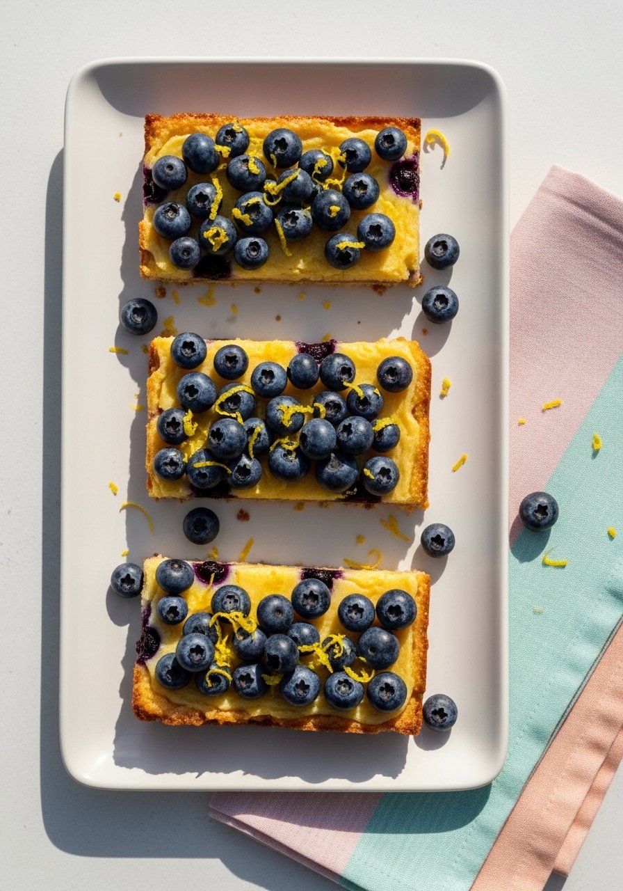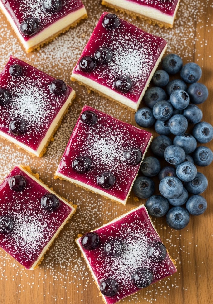 These bars combine a buttery crust, creamy cheesecake layer, and jewel-like blueberry topping. They’re showy but simple—perfect for afternoon tea or dessert tables.