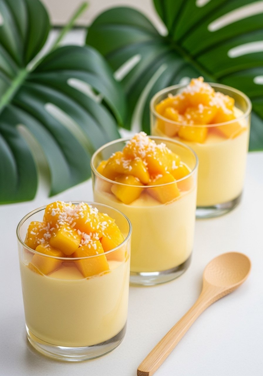 This panna cotta is set with gelatin or agar for a dreamy, wobbly texture—without any oven time. The mango-coconut combo is tropical and light.