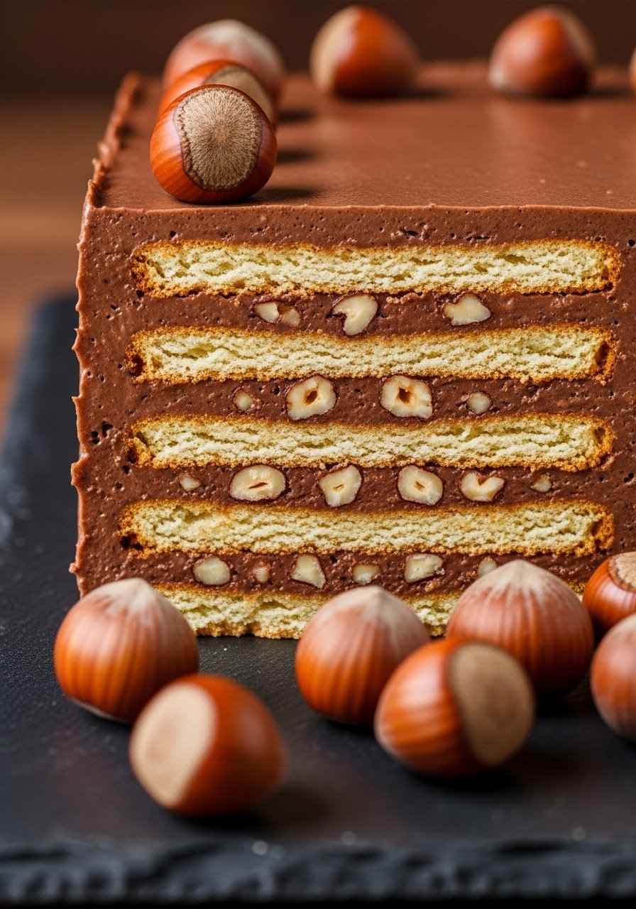 This fridge cake layers biscuits or cookies with a chocolate-hazelnut cream that firms as it chills—no oven, just time. It slices like a torte and holds up well for serving.