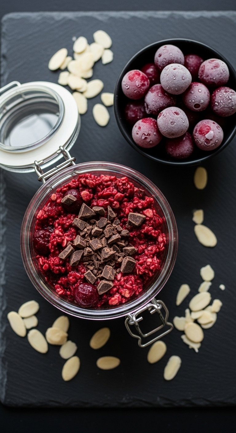Tart cherries and dark cocoa pair beautifully here. The almonds add crunchy contrast and a toasty note. These oats feel sophisticated but stay easy to prepare.